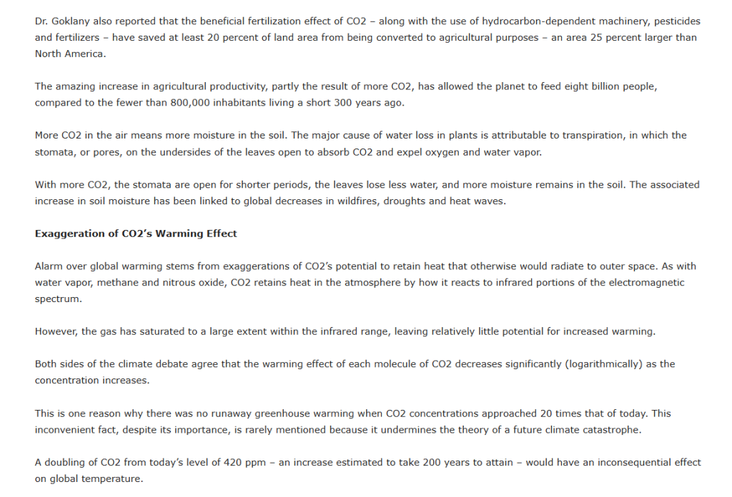 Dr. Goklany also reported that the beneficial fertilization effect of CO2 – along with the use of hydrocarbon-dependent machinery, pesticides and fertilizers – have saved at least 20 percent of land area from being converted to agricultural purposes – an area 25 percent larger than North America.