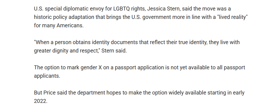 “The Department of State continues the process of updating its policies regarding gender markers on U.S. passports and Consular Reports of Birth Abroad (CRBAs) to better serve all U.S. citizens, regardless of their gender identity,” press secretary Ned Price said in a statement.
