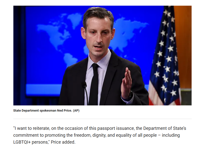 “I want to reiterate, on the occasion of this passport issuance, the Department of State’s commitment to promoting the freedom, dignity, and equality of all people – including LGBTQI+ persons,” Price added.