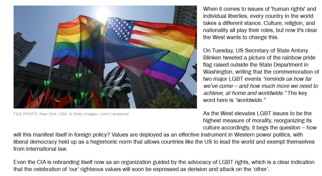 As the West elevates LGBT issues to be the highest measure of morality, reorganizing its culture accordingly, it begs the question – how will this manifest itself in foreign policy? Values are deployed as an effective instrument in Western power politics, with liberal democracy held up as a hegemonic norm that allows countries like the US to lead the world and exempt themselves from international law.