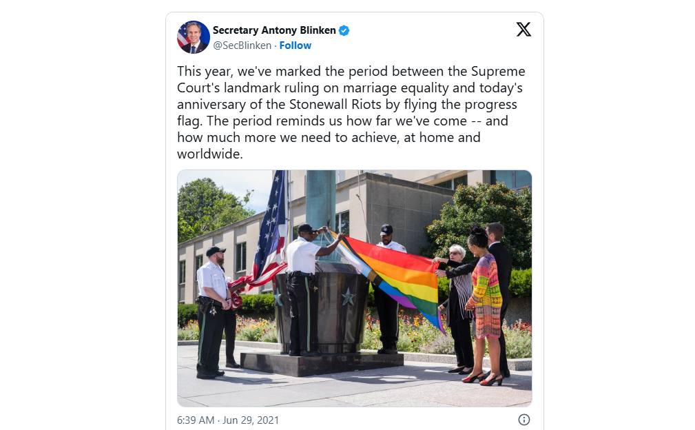 On Tuesday, US Secretary of State Antony Blinken tweeted a picture of the rainbow pride flag raised outside the State Department in Washington, writing that the commemoration of two major LGBT events “reminds us how far we’ve come – and how much more we need to achieve, at home and worldwide.” The key word here is “worldwide.”