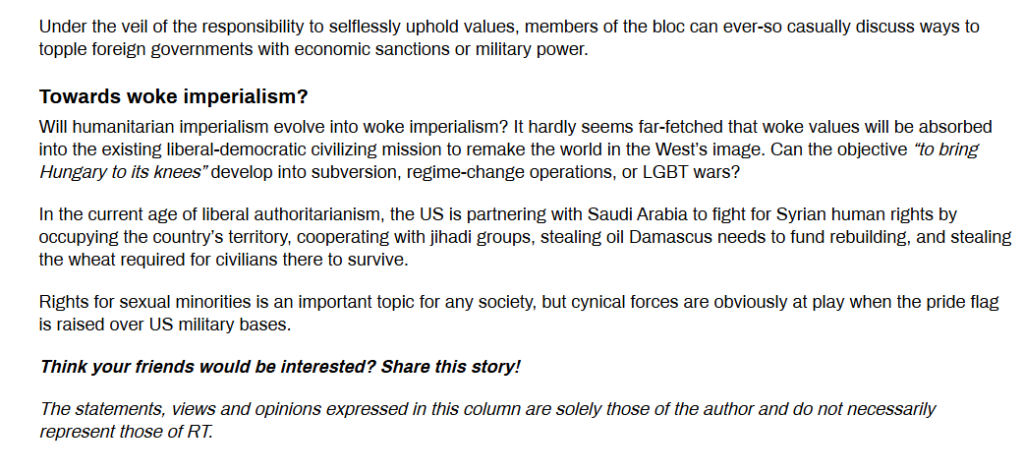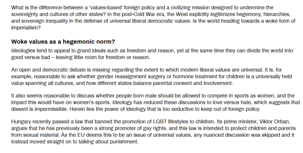 Will humanitarian imperialism evolve into woke imperialism? It hardly seems far-fetched that woke values will be absorbed into the existing liberal-democratic civilizing mission to remake the world in the West’s image. Can the objective “to bring Hungary to its knees” develop into subversion, regime-change operations, or LGBT wars?
