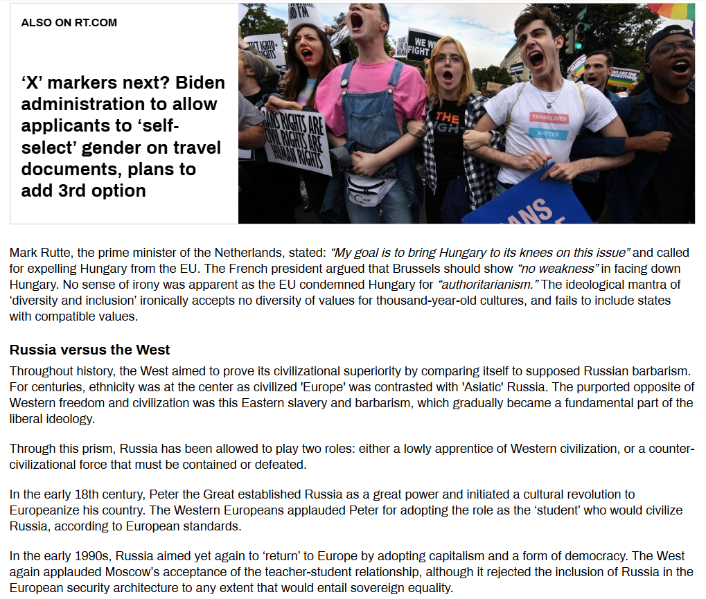 Mark Rutte, the prime minister of the Netherlands, stated: “My goal is to bring Hungary to its knees on this issue” and called for expelling Hungary from the EU. The French president argued that Brussels should show “no weakness” in facing down Hungary. No sense of irony was apparent as the EU condemned Hungary for “authoritarianism.” The ideological mantra of ‘diversity and inclusion’ ironically accepts no diversity of values for thousand-year-old cultures, and fails to include states with compatible values.