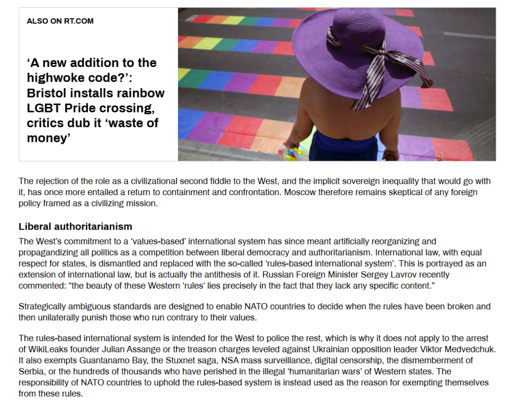 The rules-based international system is intended for the West to police the rest, which is why it does not apply to the arrest of WikiLeaks founder Julian Assange or the treason charges leveled against Ukrainian opposition leader Viktor Medvedchuk. It also exempts Guantanamo Bay, the Stuxnet saga, NSA mass surveillance, digital censorship, the dismemberment of Serbia, or the hundreds of thousands who have perished in the illegal ‘humanitarian wars’ of Western states. The responsibility of NATO countries to uphold the rules-based system is instead used as the reason for exempting themselves from these rules.