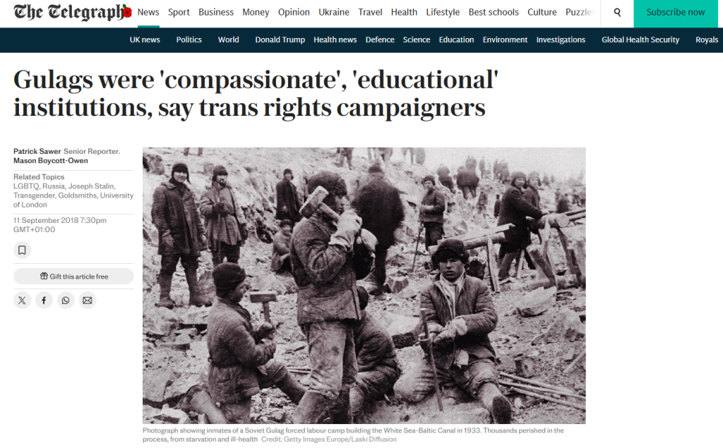 Trans rights campaigners at Goldsmiths University described the Gulags as benign places where inmates received education, training and enjoyed the opportunity to take part in clubs, sports and theatre groups.