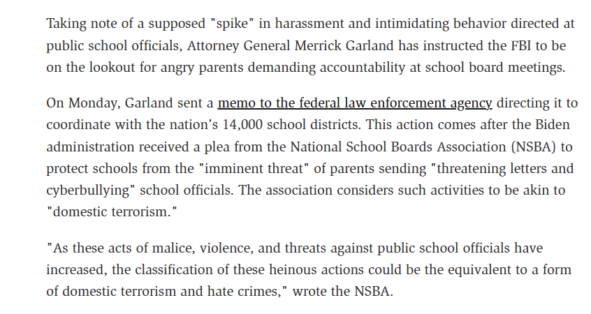 On Monday, Garland sent a memo to the federal law enforcement agency directing it to coordinate with the nation’s 14,000 school districts. This action comes after the Biden administration received a plea from the National School Boards Association (NSBA) to protect schools from the “imminent threat” of parents sending “threatening letters and cyberbullying” school officials. The association considers such activities to be akin to “domestic terrorism.”