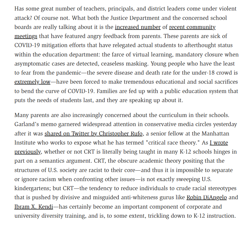 Many parents are also increasingly concerned about the curriculum in their schools. Garland’s memo garnered widespread attention in conservative media circles yesterday after it was shared on Twitter by Christopher Rufo, a senior fellow at the Manhattan Institute who works to expose what he has termed “critical race theory.” As I wrote previously, whether or not CRT is literally being taught in many K-12 schools hinges in part on a semantics argument. CRT, the obscure academic theory positing that the structures of U.S. society are racist to their core—and thus it is impossible to separate or ignore racism when confronting other issues—is not exactly sweeping U.S. kindergartens; but CRT—the tendency to reduce individuals to crude racial stereotypes that is pushed by divisive and misguided anti-whiteness gurus like Robin DiAngelo and Ibram X. Kendi—has certainly become an important component of corporate and university diversity training, and is, to some extent, trickling down to K-12 instruction.