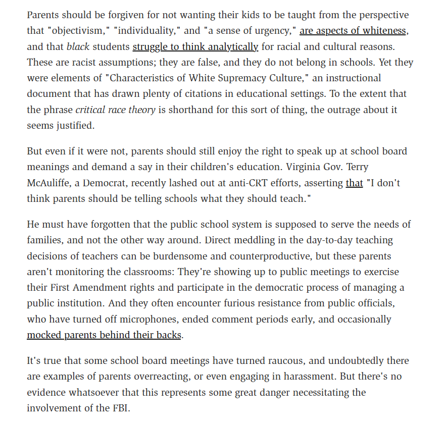 Parents should be forgiven for not wanting their kids to be taught from the perspective that “objectivism,” “individuality,” and “a sense of urgency,” are aspects of whiteness, and that black students struggle to think analytically for racial and cultural reasons. These are racist assumptions; they are false, and they do not belong in schools. Yet they were elements of “Characteristics of White Supremacy Culture,” an instructional document that has drawn plenty of citations in educational settings. To the extent that the phrase critical race theory is shorthand for this sort of thing, the outrage about it seems justified.