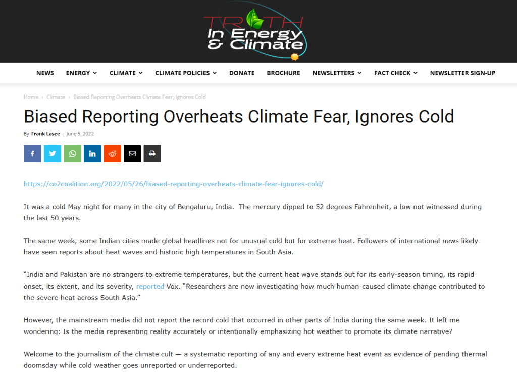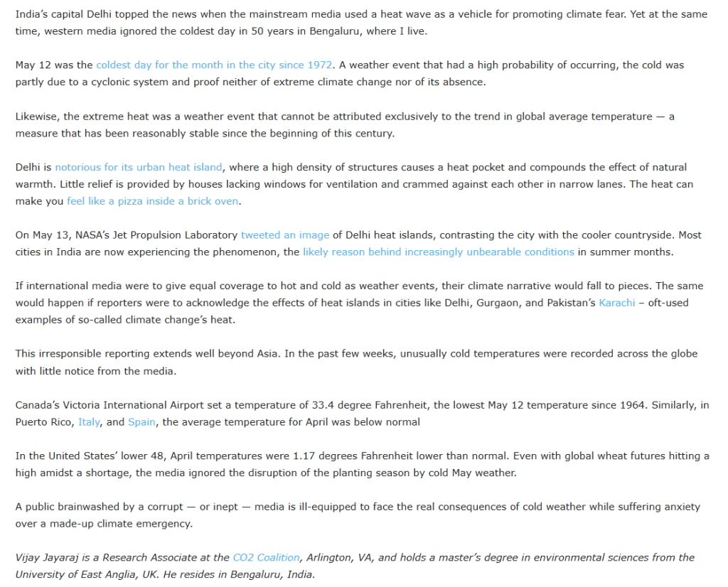 India’s capital Delhi topped the news when the mainstream media used a heat wave as a vehicle for promoting climate fear. Yet at the same time, western media ignored the coldest day in 50 years in Bengaluru, where I live.